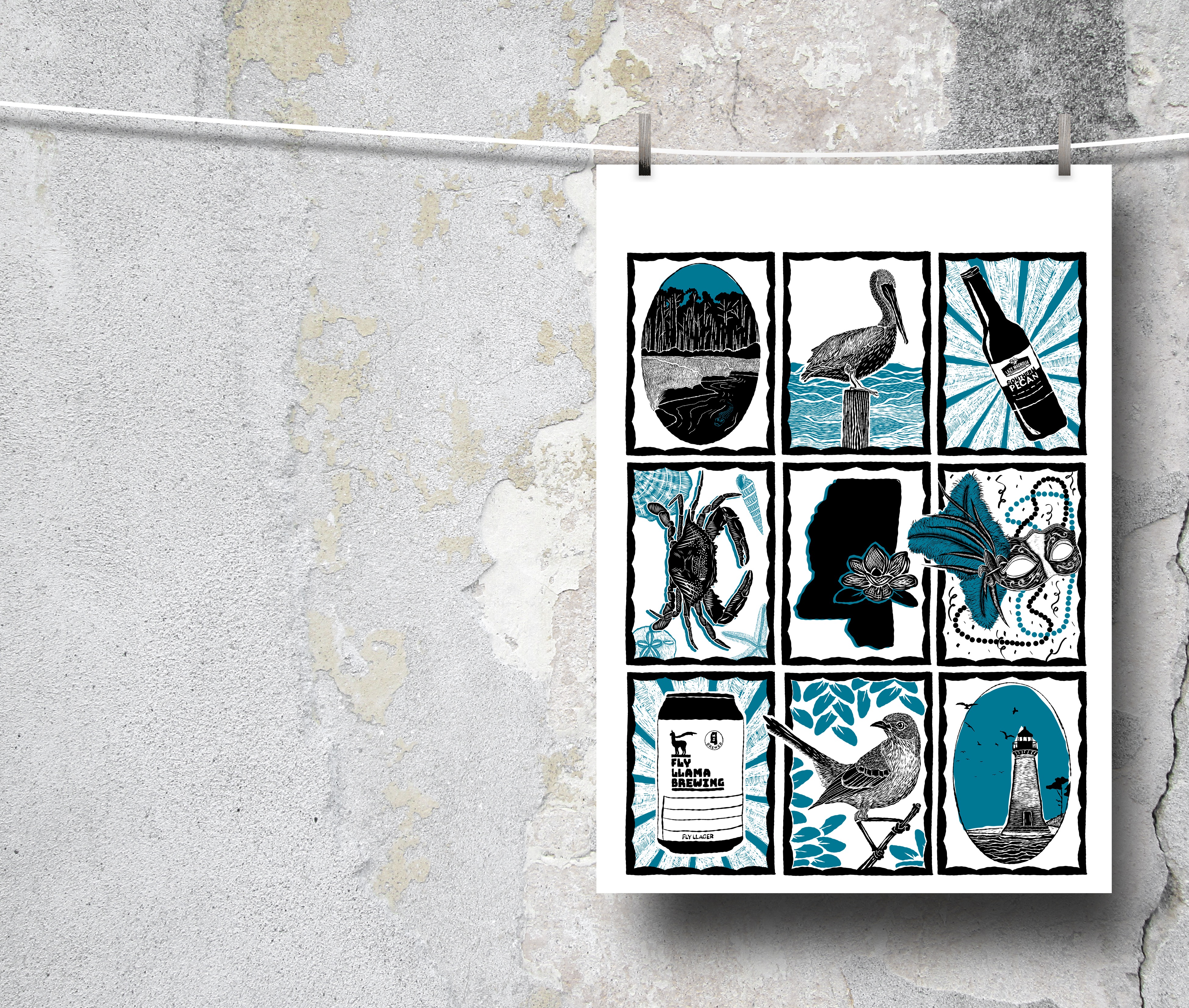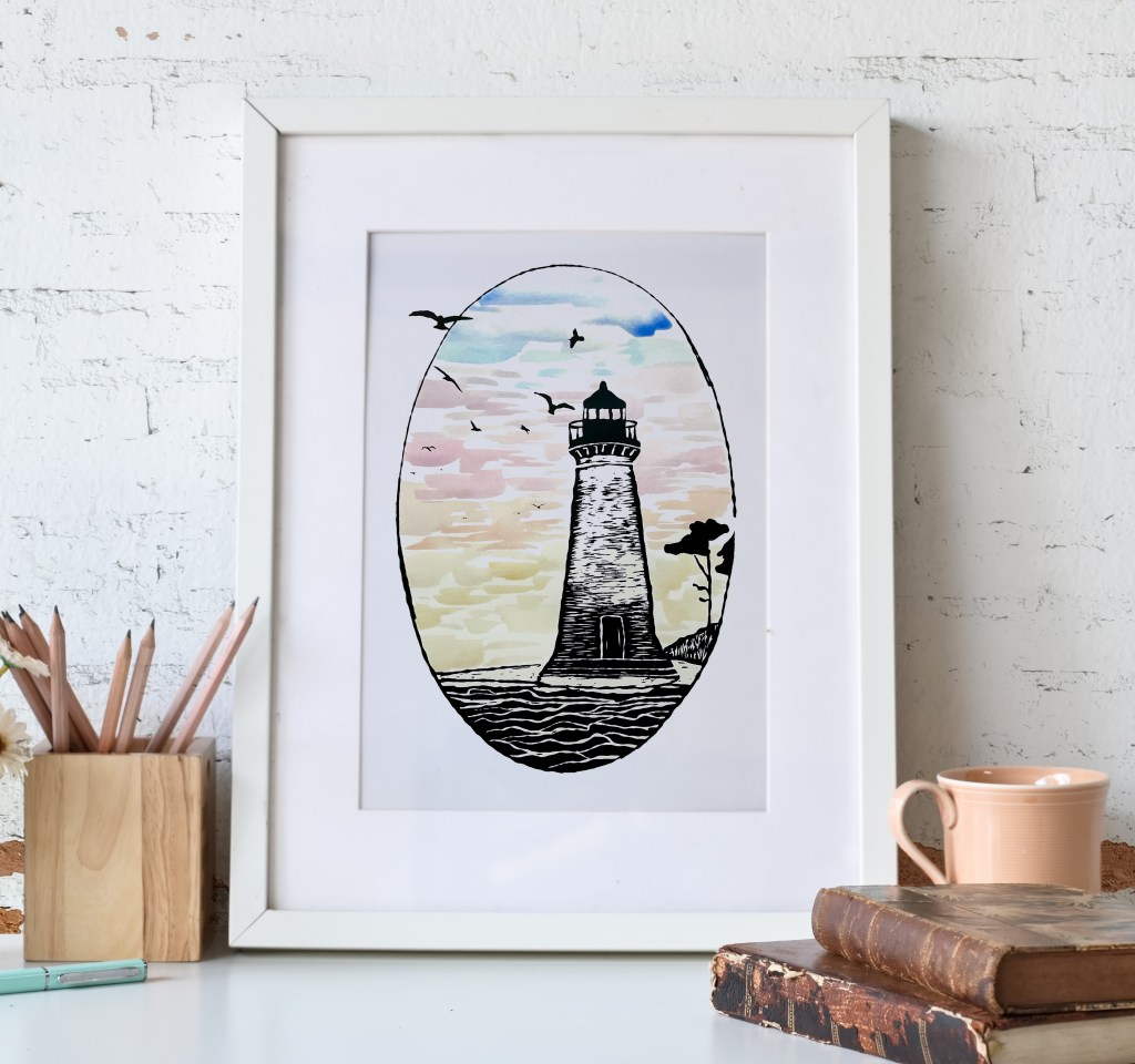 Watercolor sunset with serigraph lighthouse overlay. Each work is a hand-painted original with hand-pulled silkscreen print overlay.
